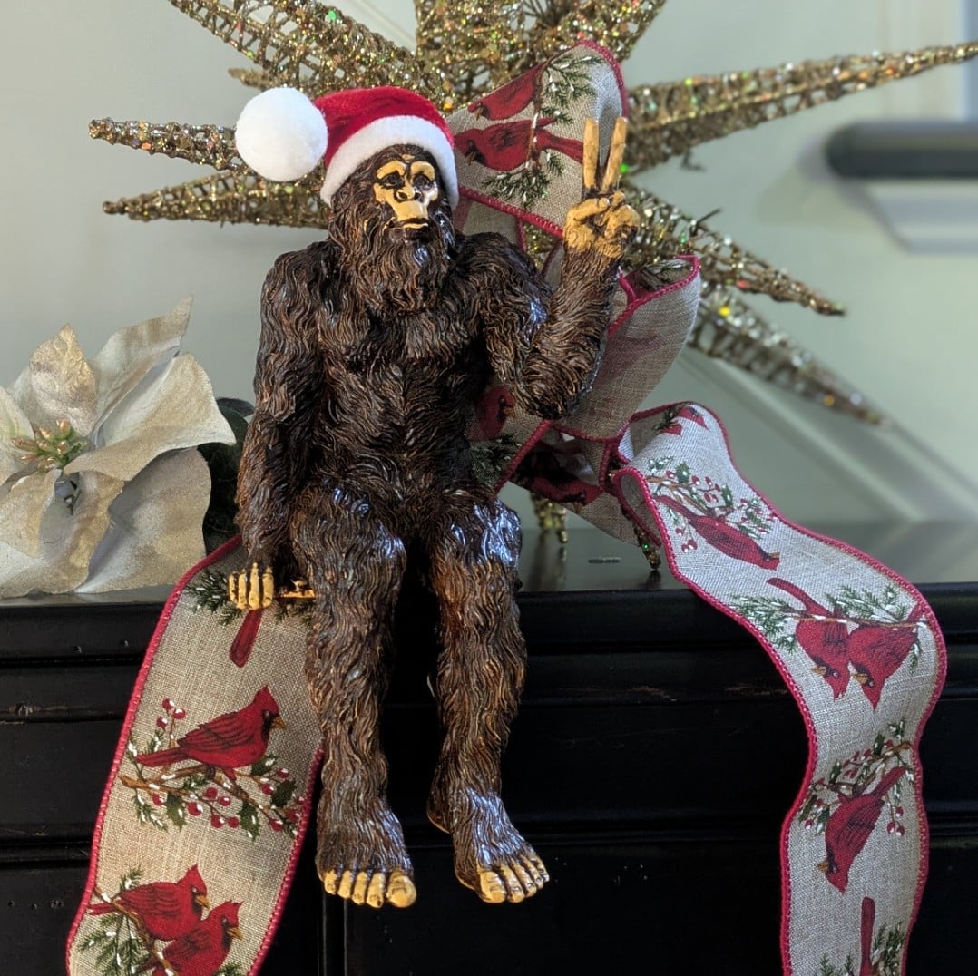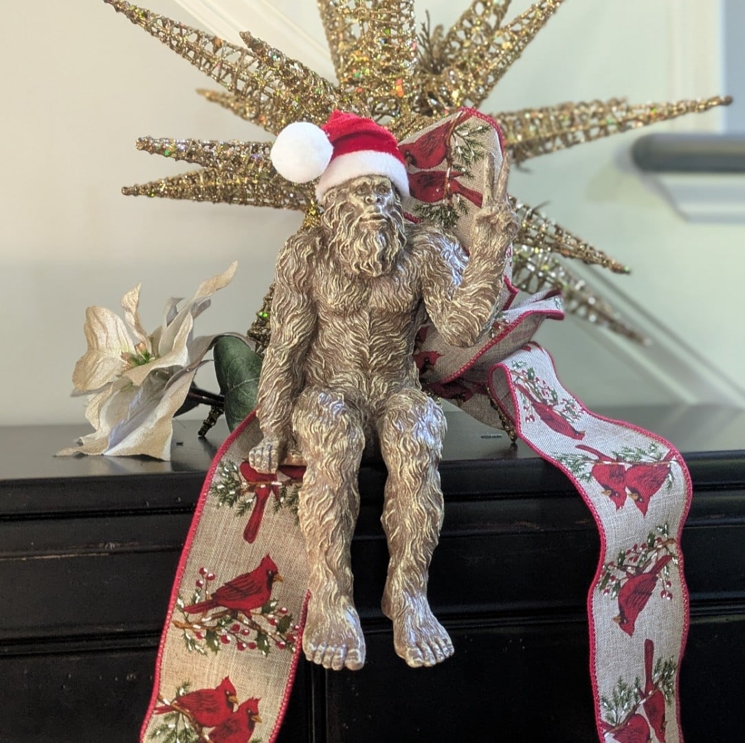 Christmas Bigfoot Peace Sign Decorative Sasquatch Yeti Statue/Figurine Indoor/Outdoor Sculpture for Home, Office, Patio, Deck 10 in H Shelf Sitter Figurine – Stonewash