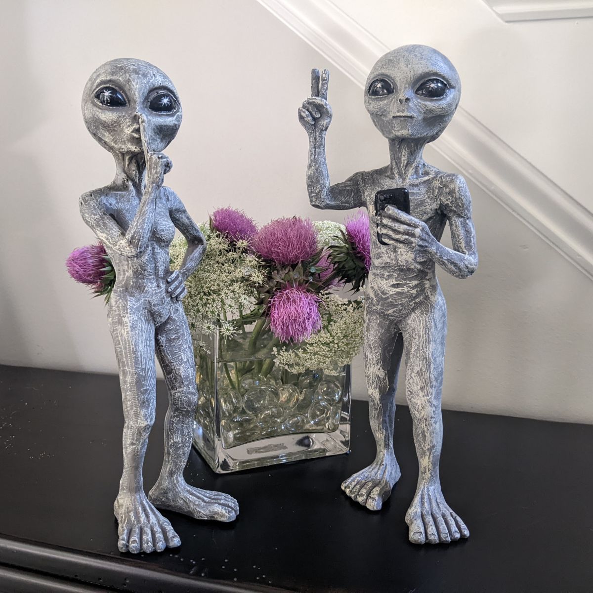 Alien Statues “Peace & Quiet” hang out under their space ship in my front yard.
