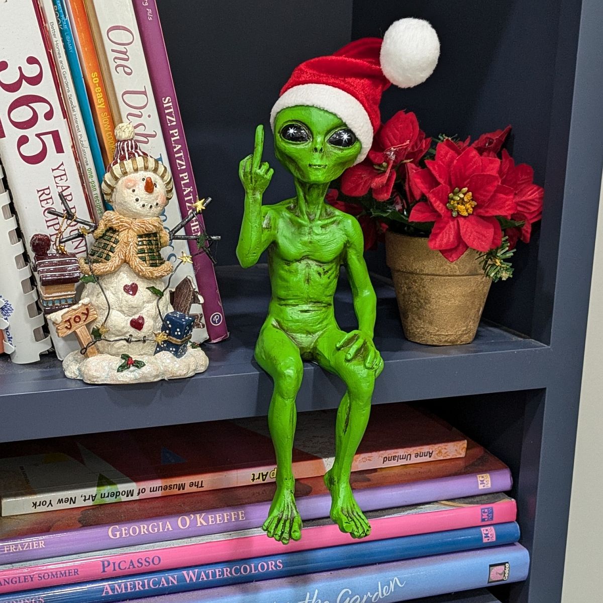 Scrooge McAlien Rude Christmas Alien Statue “Flipping The Bird” 10″ H Shelf Sitter Figurine Funny Christmas Decoration – Cosmic Green