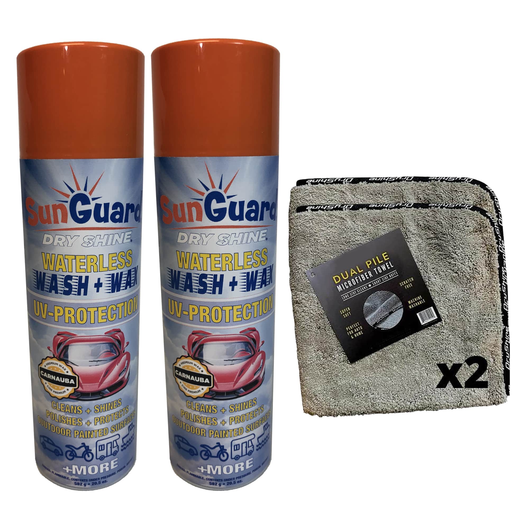 2-Pack Sunguard®/Dry-Shine® Detailing Kit: 2 – 20.5oz Cans Waterless Wash + Wax with UV Protection and 4 Dual Pile Microfiber Towels. Cleans + Shines, Polishes + Protects Outdoor Painted Surfaces. For Cars, Trucks, Motorcycles, Sports Vehicles, Campers, Trailers, Boats + MORE